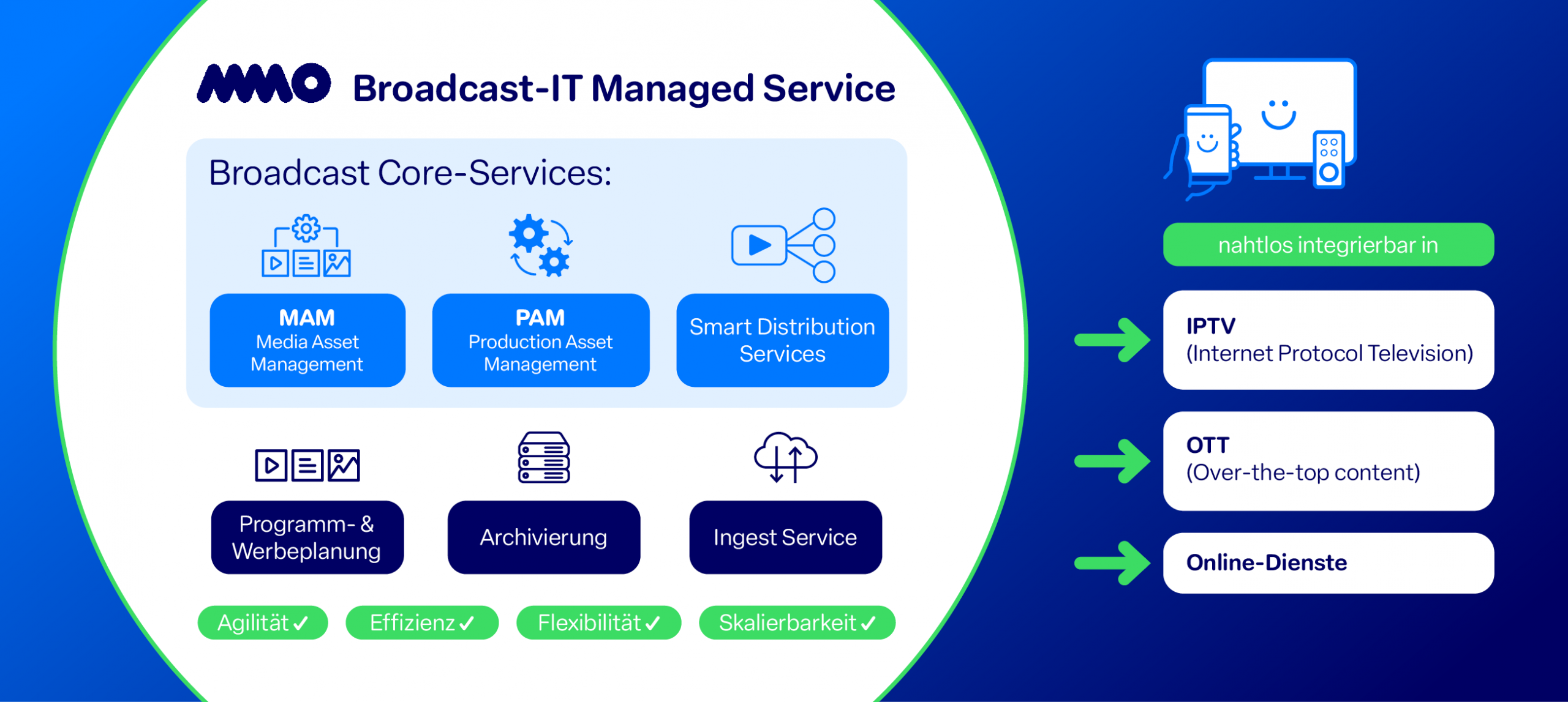MMO bietet Medien-Unternehmen, Content Ownern und Linzenzinhabern die volle Bandbreite des Cloud Playout, mit dem sie Ihre Inhalte zielgerichteter und kostengünstiger automatisiert auf verschiedene Channels bringen und so mehr interessiertes Publikum erreichen.
